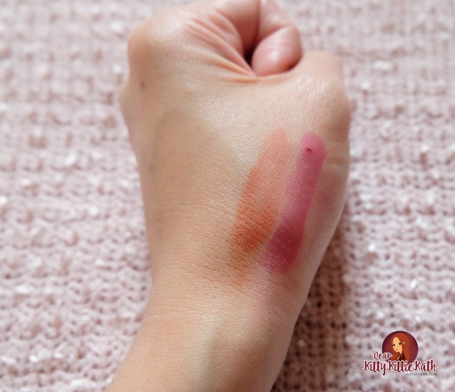 The shades I have are Pretty Sexy and Beauty Siren. The first shade looks violet inside the roll on type packaging but once applied it gives a purplish red shade. On the other hand, the second shade gives a peachy shade after application.